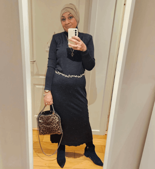 Feeling chic and comfortable in this outfit. The sweater dress is so easy to wear, and the boots add a touch of edge. 🖤
