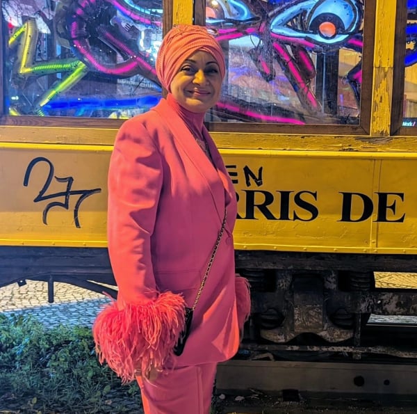 Love the feather detail on this bright pink suit