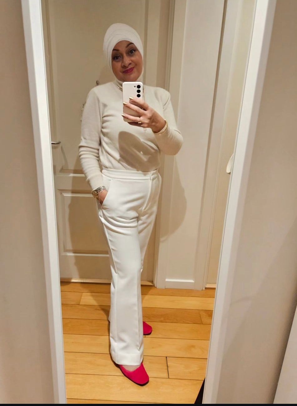 "Embracing the elegance of simplicity in all white, with a pop of pink to keep it fun!